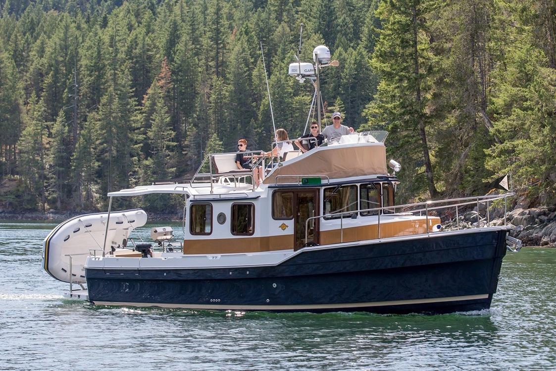 The R-31 CB shares many of the features and qualities of her smaller sisterships but some notable additions to this larger model make her ideal for extended cruising while still being a trailerable trawler. The R-31 CB is the first Ranger Tug to feature a flybridge equipped with electronic controls at both the upper and lower helm. The flybridge also retracts to allow for trailering the 31’. The builders at Ranger Tugs also equipped the foredeck with seating and a table that can be raised or lowered depending on whether the boat is under way or at anchor or dock for entertaining. In addition to the extra seating now available on the flybridge and foredeck the R-31 CB allows for a larger cockpit area with wraparound seating and extra seating that folds out of the gunwale. When not entertaining, seats are folded leaving the cockpit unencumbered.