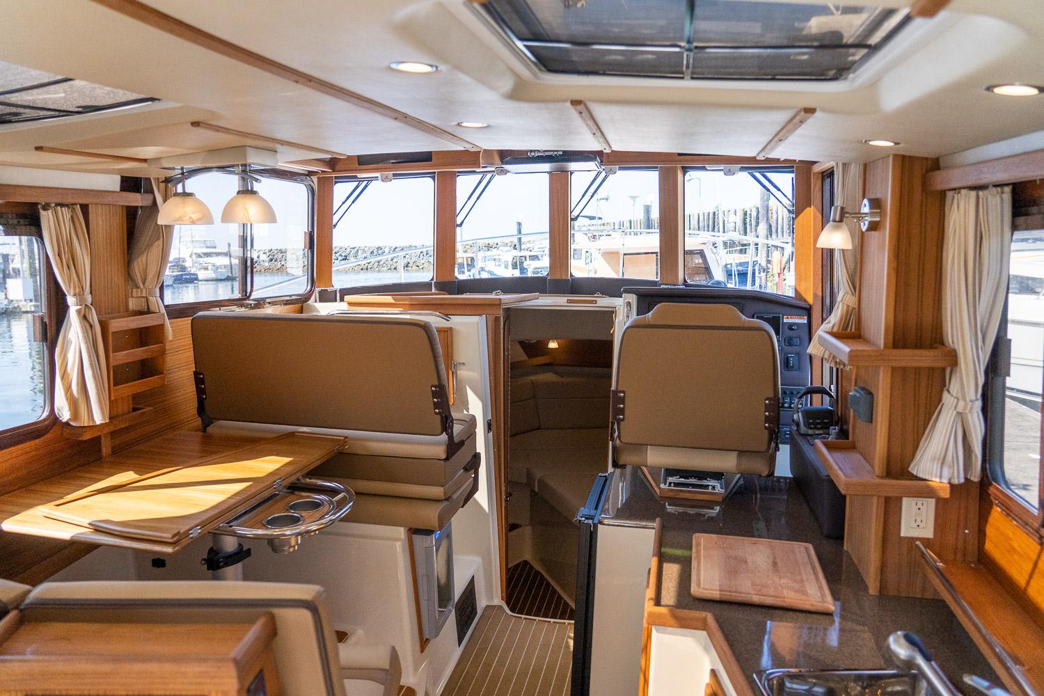 The interior layout of the R-31 CB features two staterooms—one large island berth forward with en suite head and a midship berth and day head. Those who are familiar with Ranger Tugs models will recognize the galley layout and lower helm station that maximize interior space. A starboard side door provides easy access from the lower helm to the side decks so crew can get to the bow for line handling.