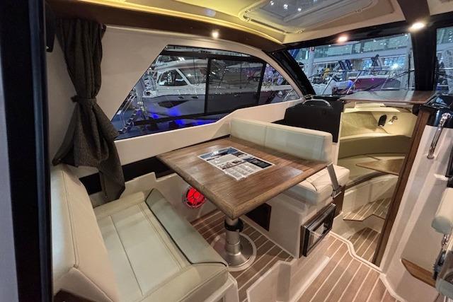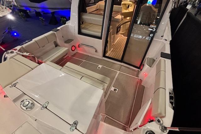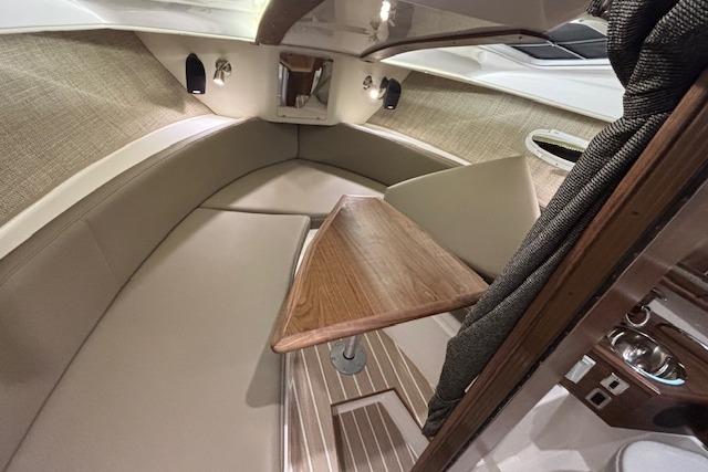 The main salon features a dinette that transforms into an additional berth as well as a mid-berth under the dinette that is great for kids, or it can be used for additional storage. Open the bifold rear glass window to the cockpit to expand your entertaining space and let the outside in.
